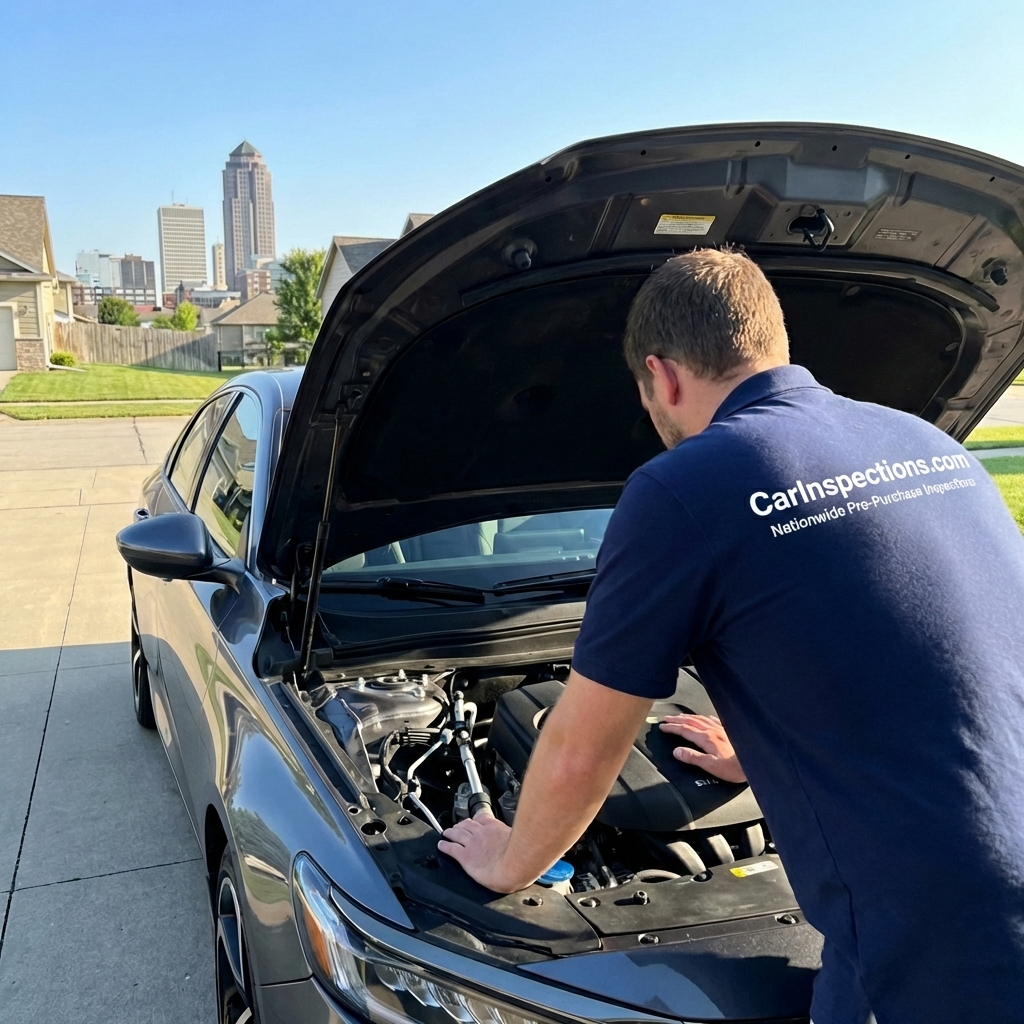 We come to wherever the car is in the Des Moines area. Our ASE-certified mechanics perform a comprehensive 200+ point inspection and deliver a detailed report with photos before you buy.